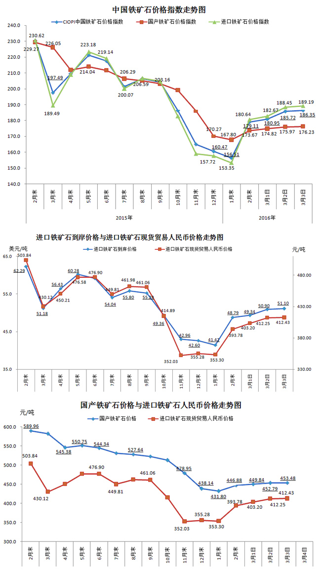 3月3日,中国铁矿石价格指数(CIOPI)186.35点,环比上升0.64点,升幅为0.34%。其中:国产铁矿石价格指数为176.23点,环比上升0.26点,升幅为0.15%;进口铁矿石价格指数为189.19点,环比上升0.74点,升幅为0.39%。
