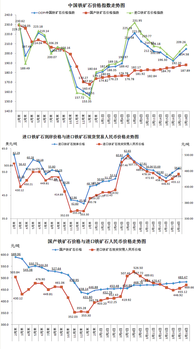 3月18日,中国铁矿石价格指数(CIOPI)204.58点,环比上升5.66点,升幅为2.84%。其中:国产铁矿石价格指数为187.89点,环比上升0.75点,升幅为0.40%;进口铁矿石价格指数为209.26点,环比上升7.03点,升幅为3.48%。