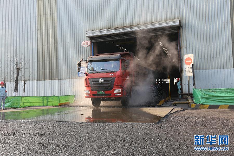 进入原料堆场的运货车辆经过“搓板路”、“蓄水池”等措施的除尘,在唯一的出口对车身进行最终彻底清洗后方可离开。(新华网 张博摄)